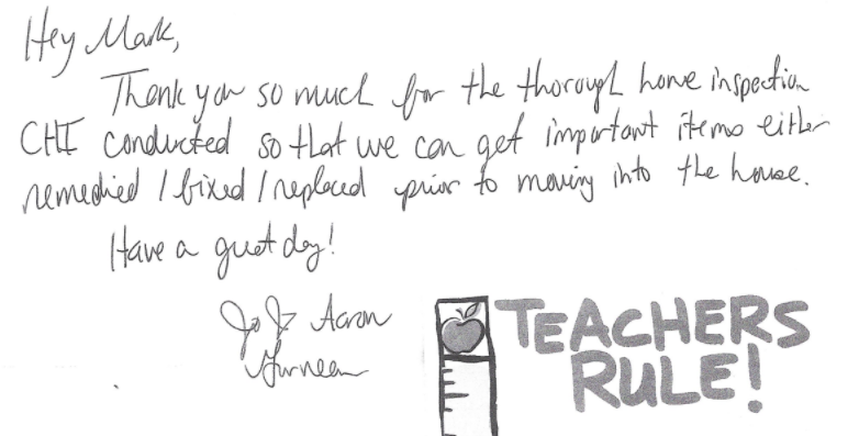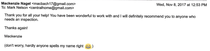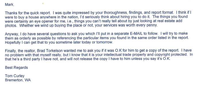 Thanks for taking the time to look over the house and answer the questions I had. Everyone that I asked for recommendations gave your name as the only one they trust and you sure lived up to their expectations.